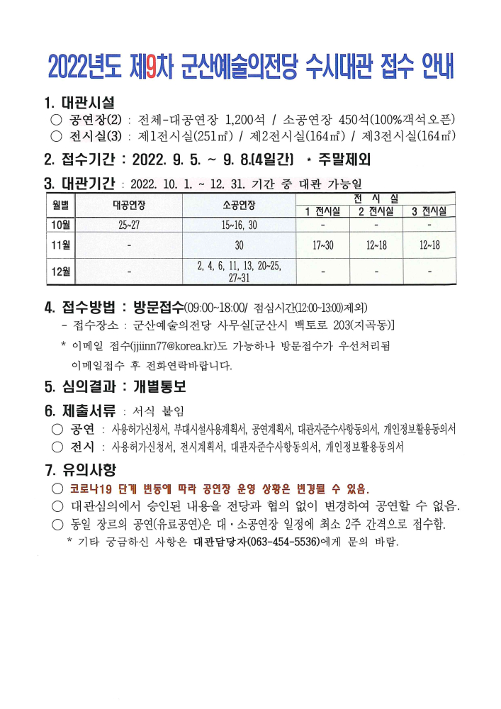 35 2022년 군산예술의전당 수시대관(10차) 접수안내 다운받기 예술의전당관리과 22.09.27 1235