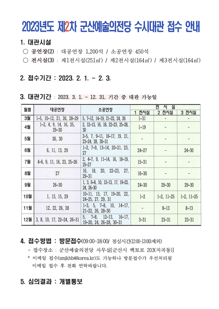39 2023년 군산예술의전당 수시대관(1차) 접수안내 다운받기 예술의전당관리과 22.12.28 1285