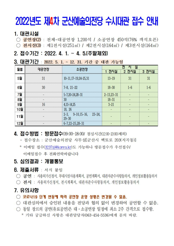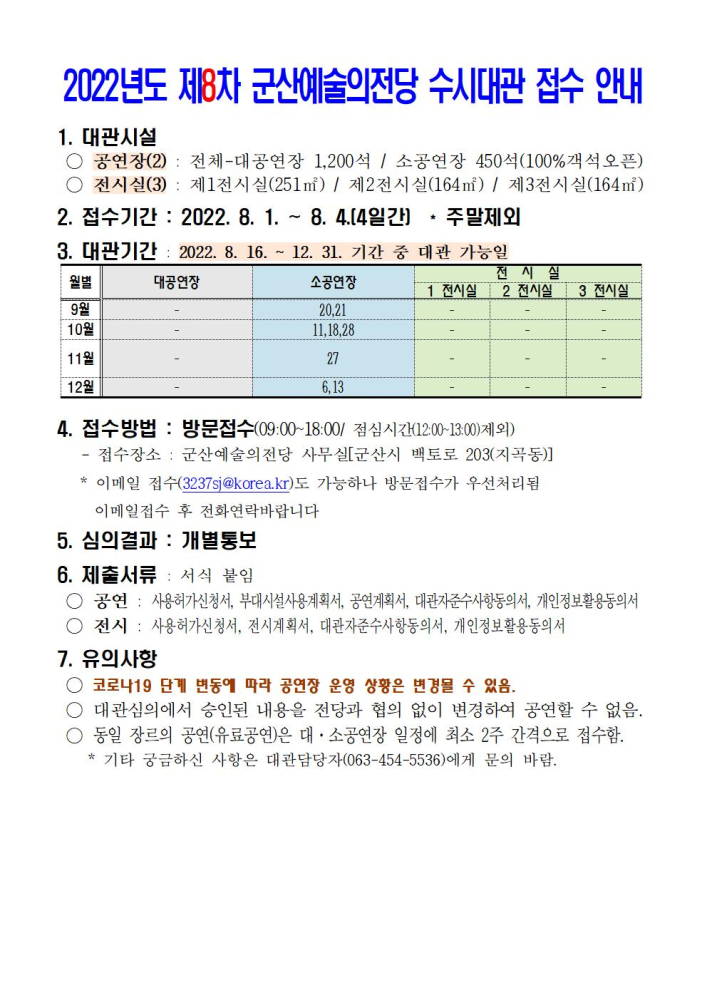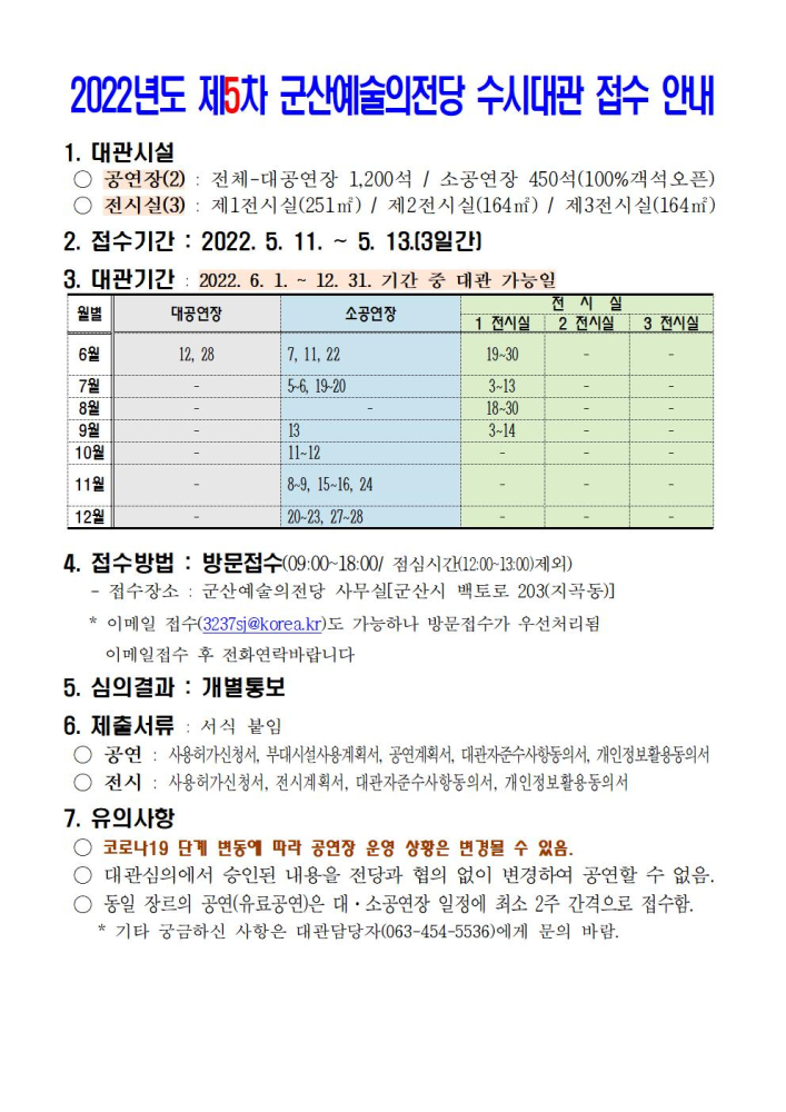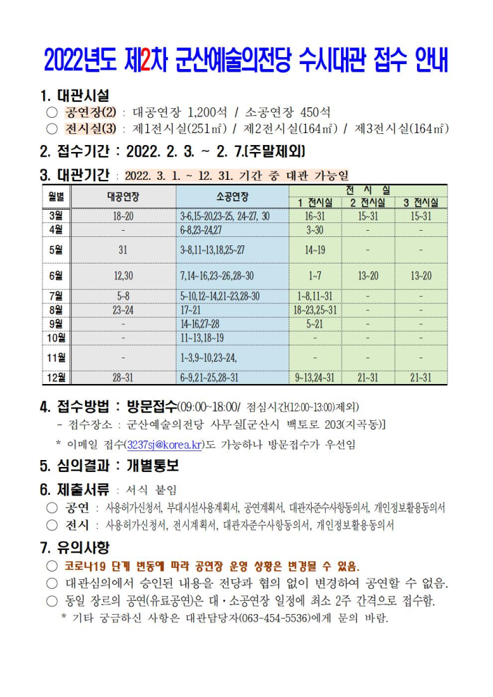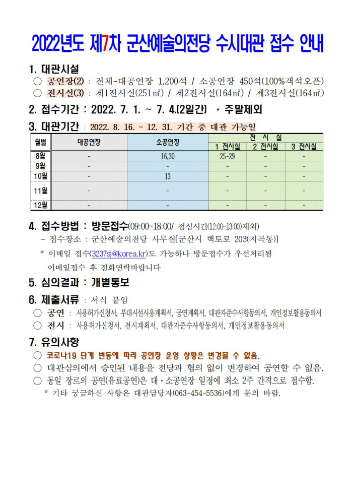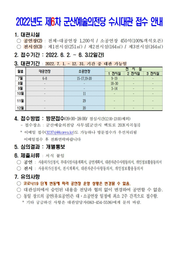32 2022년도 군산예술의전당 수시대관(제7차) 접수 안내 - 8월 잔여일, 10월 다운받기 예술의전당관리과 22.06.29 1201