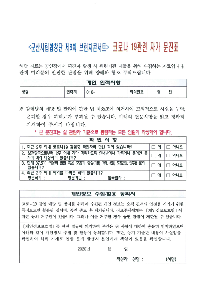 226 2020. 5.22(금) 브런치콘서트 공연장 자가문진표 다운받기 예술의전당관리과 20.05.18 4354