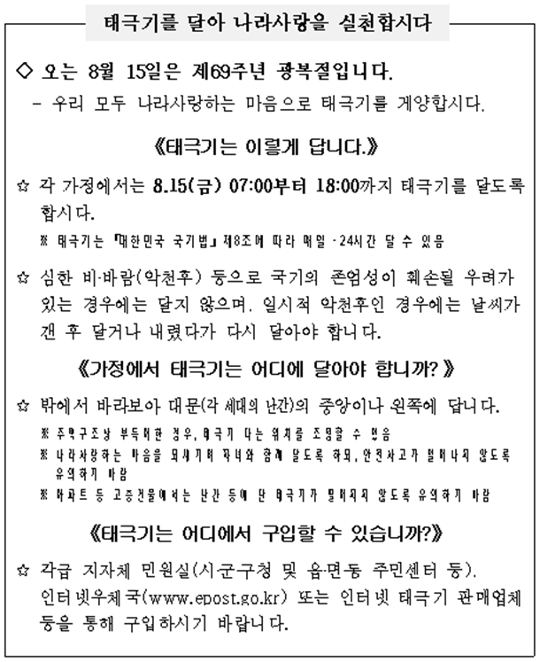 [안내] 제69주년 광복절 나라사랑 태극기 달기 운동