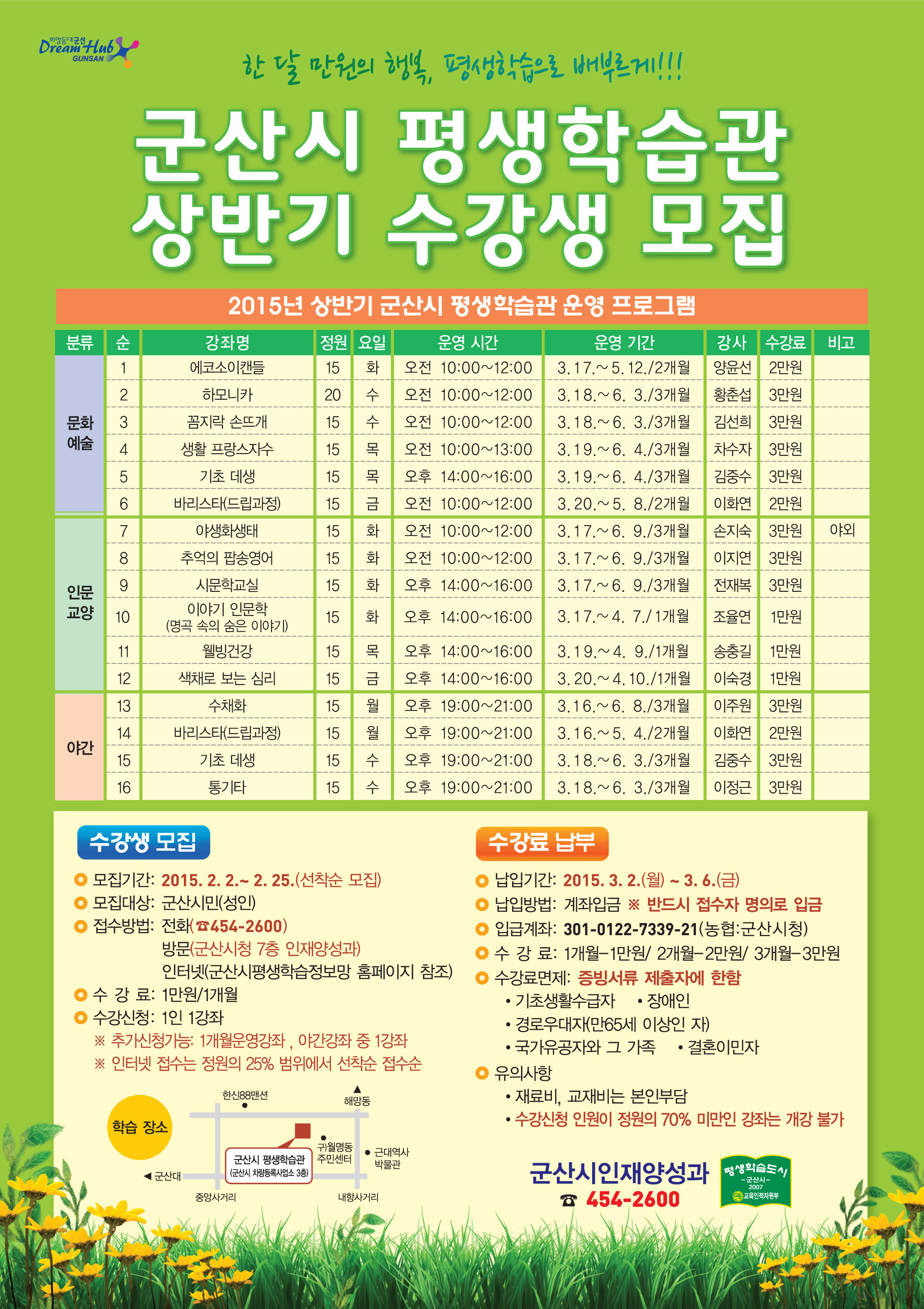 2015년 상반기 군산시 평생학습관 수강생을 다음과 같이 모집하고자 합니다. ^^