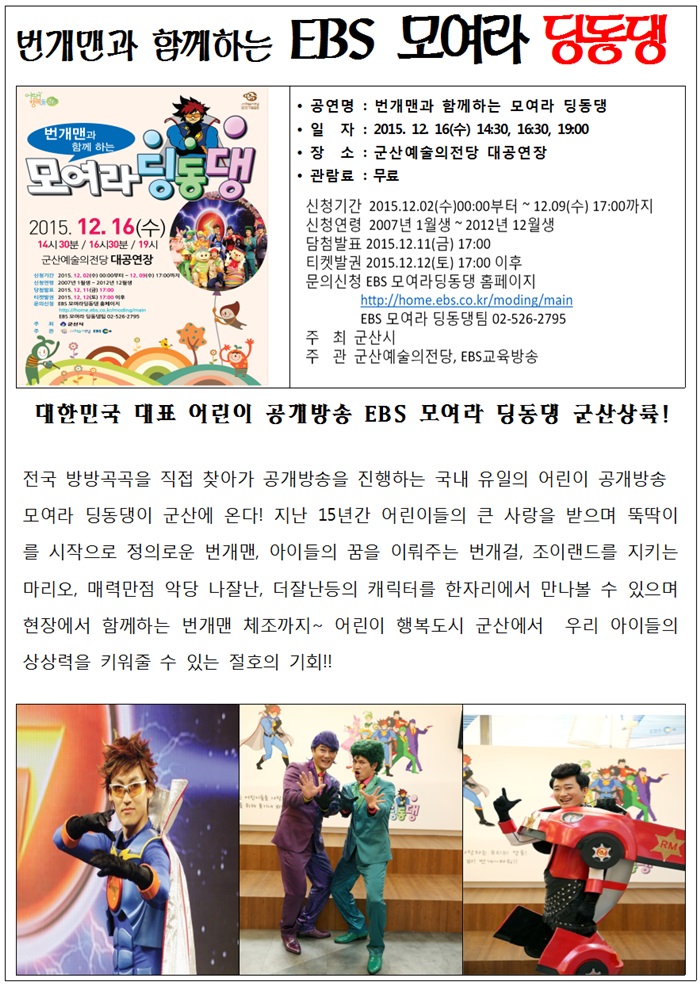 [기획공연안내] 12월 16일 대공연장 - 번개맨과 함께하는 모여라 딩동댕