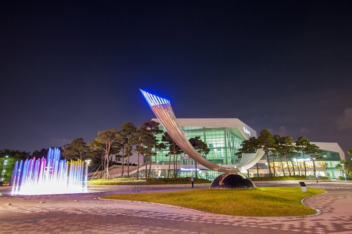 군산예술의전당 여름 야경 및 야외광장 분수 사진입니다.