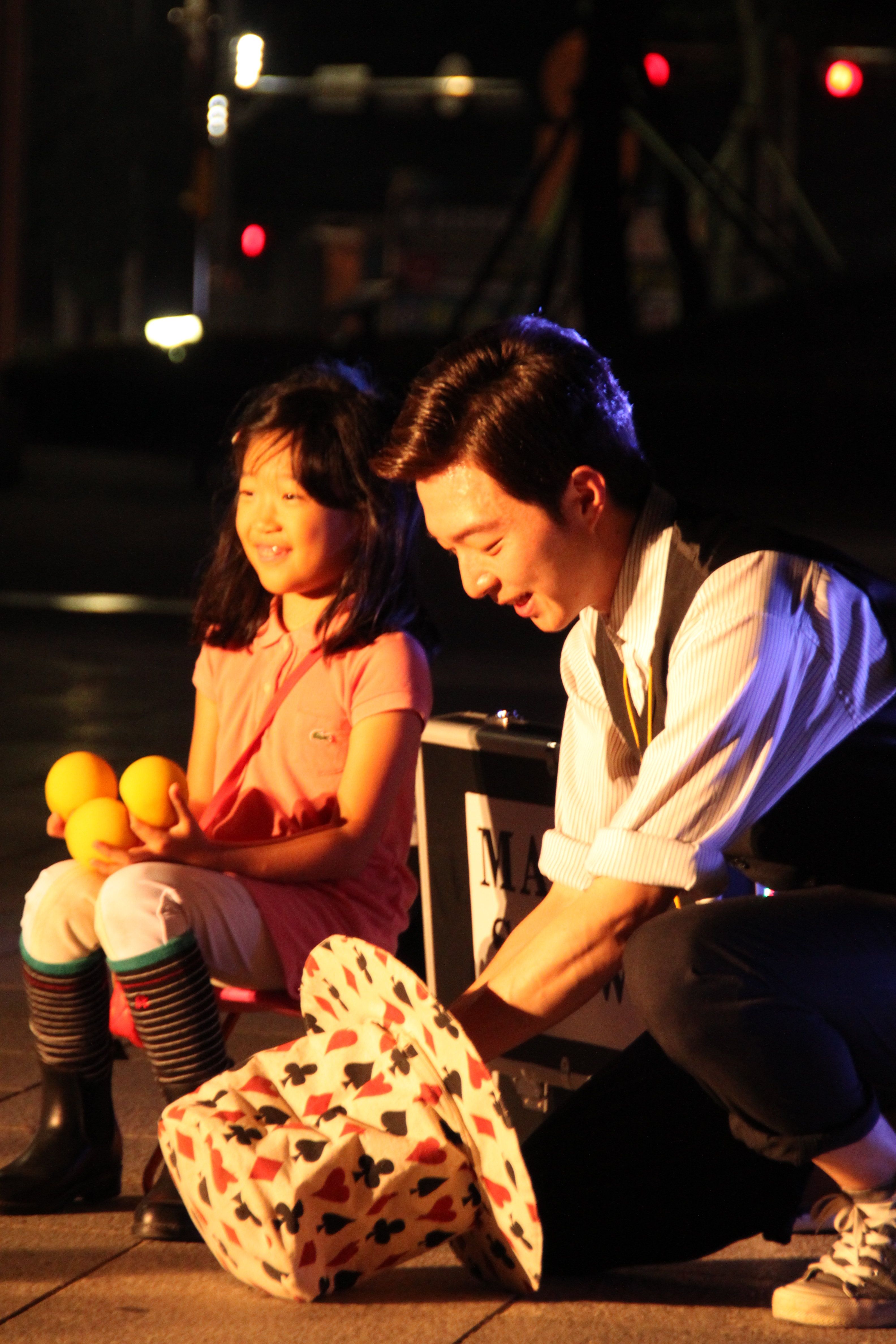 예술의전당 광장에서 이루어진 '김말이쑈'의 버스킹 공연 사진입니다.