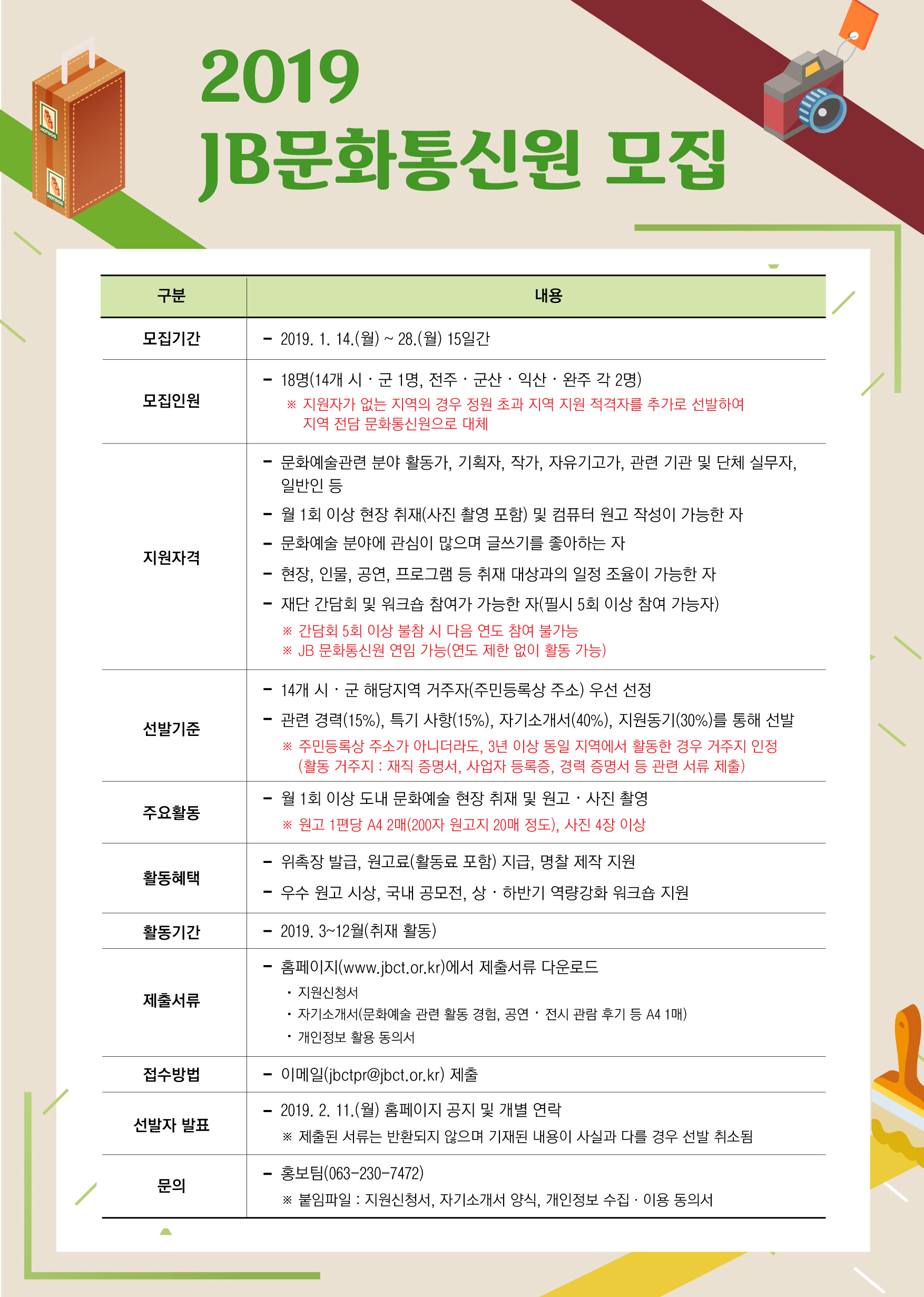 (재)전라북도문화관광재단은 전라북도 문화예술 분야의 다양한 현장 소식과 정보를 공유할 JB문화통신원을 모집합니다. 많은 관심과 신청 바랍니다.