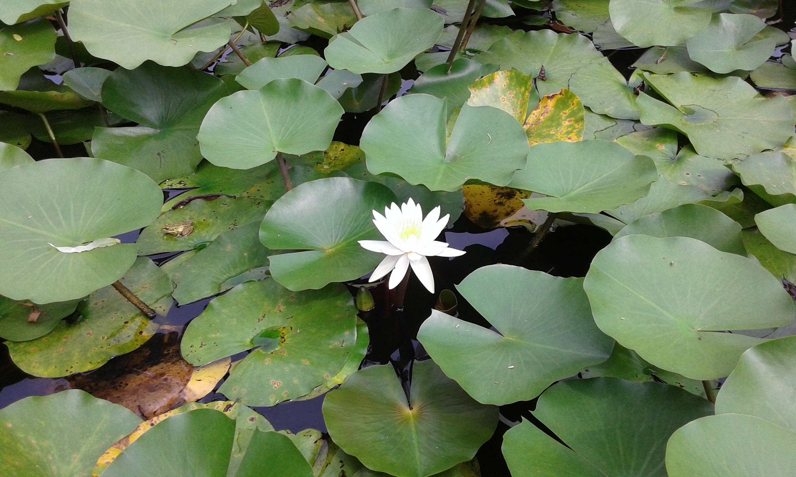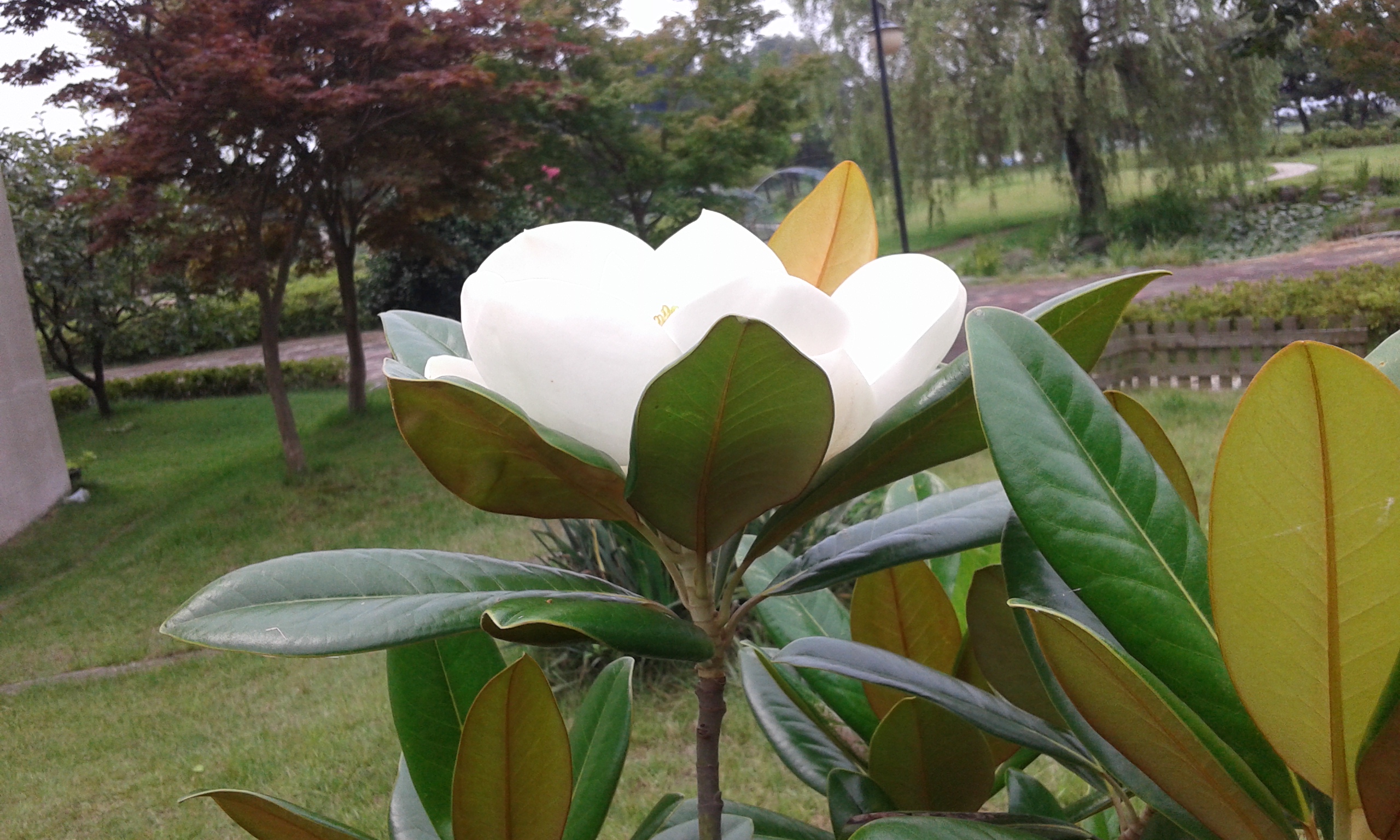문학광장 수련연못과 광장잔디밭에 피어난 천리향 한송이