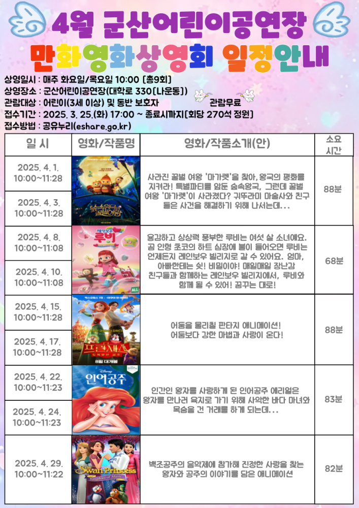 104 2025년 4월 군산어린이공연장 어린이 만화영화 상영 안내 다운받기 예술의전당관리과 25.03.24 542
