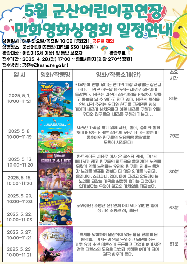 107 2025년 5월 군산어린이공연장 어린이 만화영화 상영 안내 다운받기 예술의전당관리과 25.04.25 450