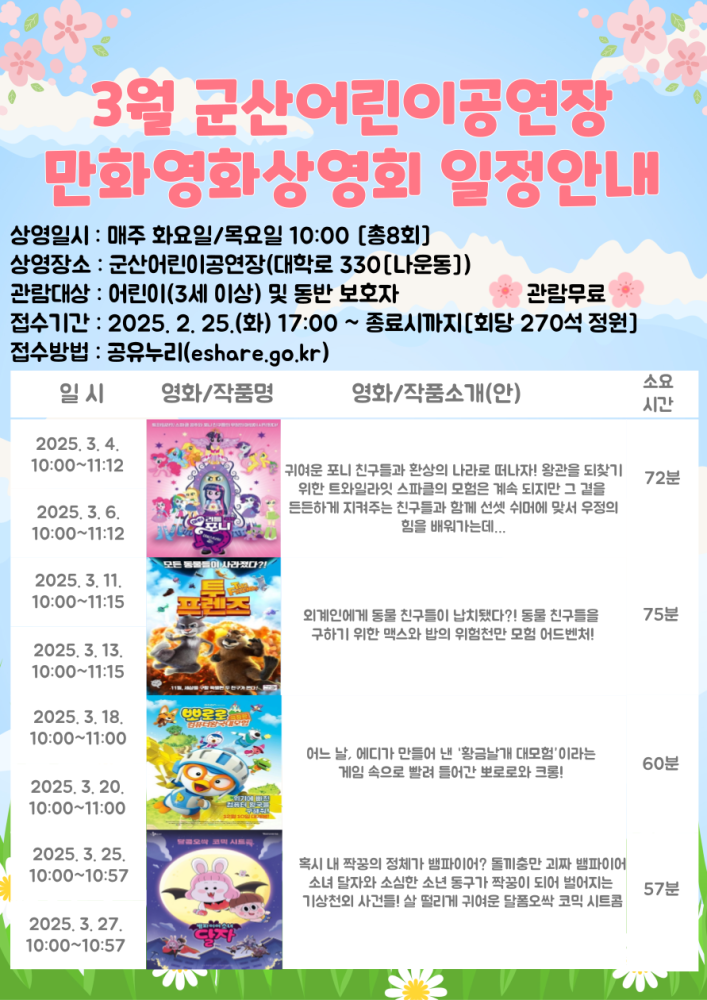 101 2025년 3월 군산어린이공연장 만화영화상영회 다운받기 예술의전당관리과 25.02.24 474