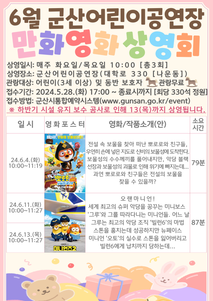 90 2024년 6월 군산어린이공연장 만화영화상영회 다운받기 예술의전당관리과 24.05.22 635