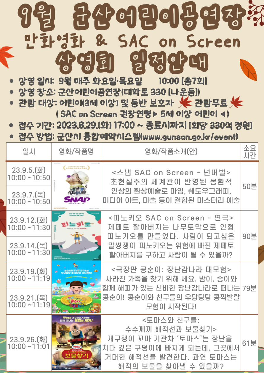 2023년 9월 군산어린이공연장 만화영화 & SAC on Screen 상영회 일정 안내