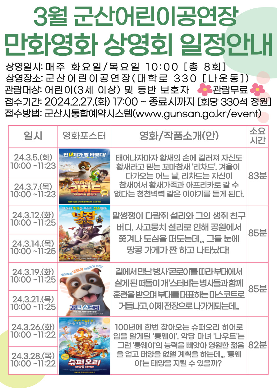 2024년 3월 군산어린이공연장 만화영화 상영회 일정 안내