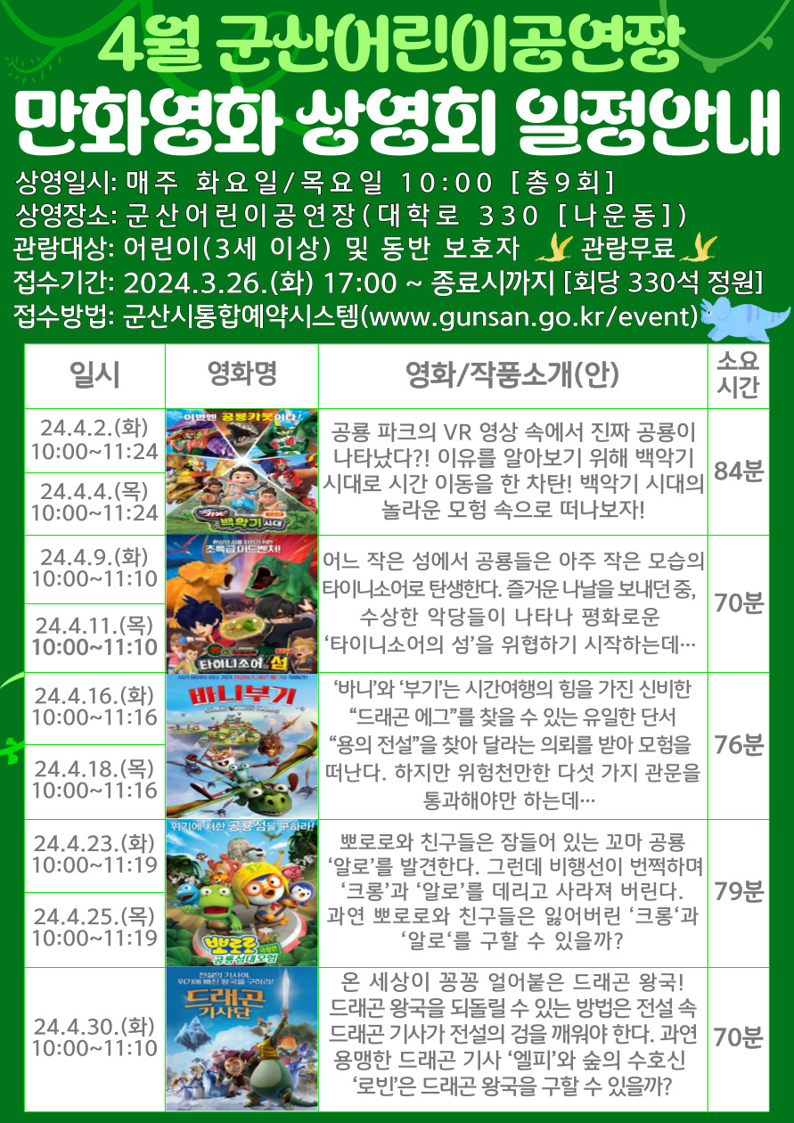 2024년 4월 군산어린이공연장 만화영화 상영회 일정 안내