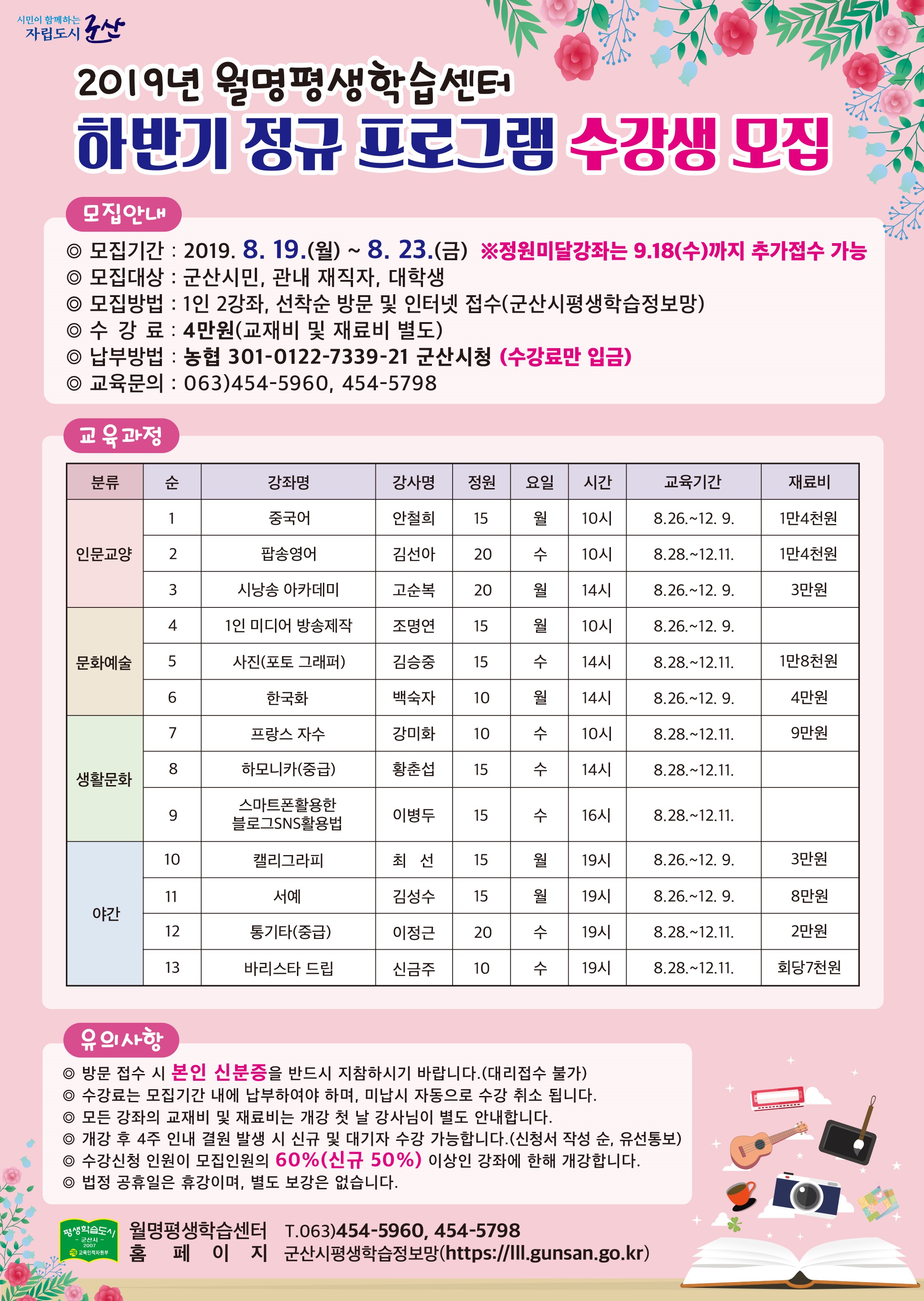 | 9 | 2019년 월명평생학습센터 하반기 정규 프로그램 수강생 모집 |