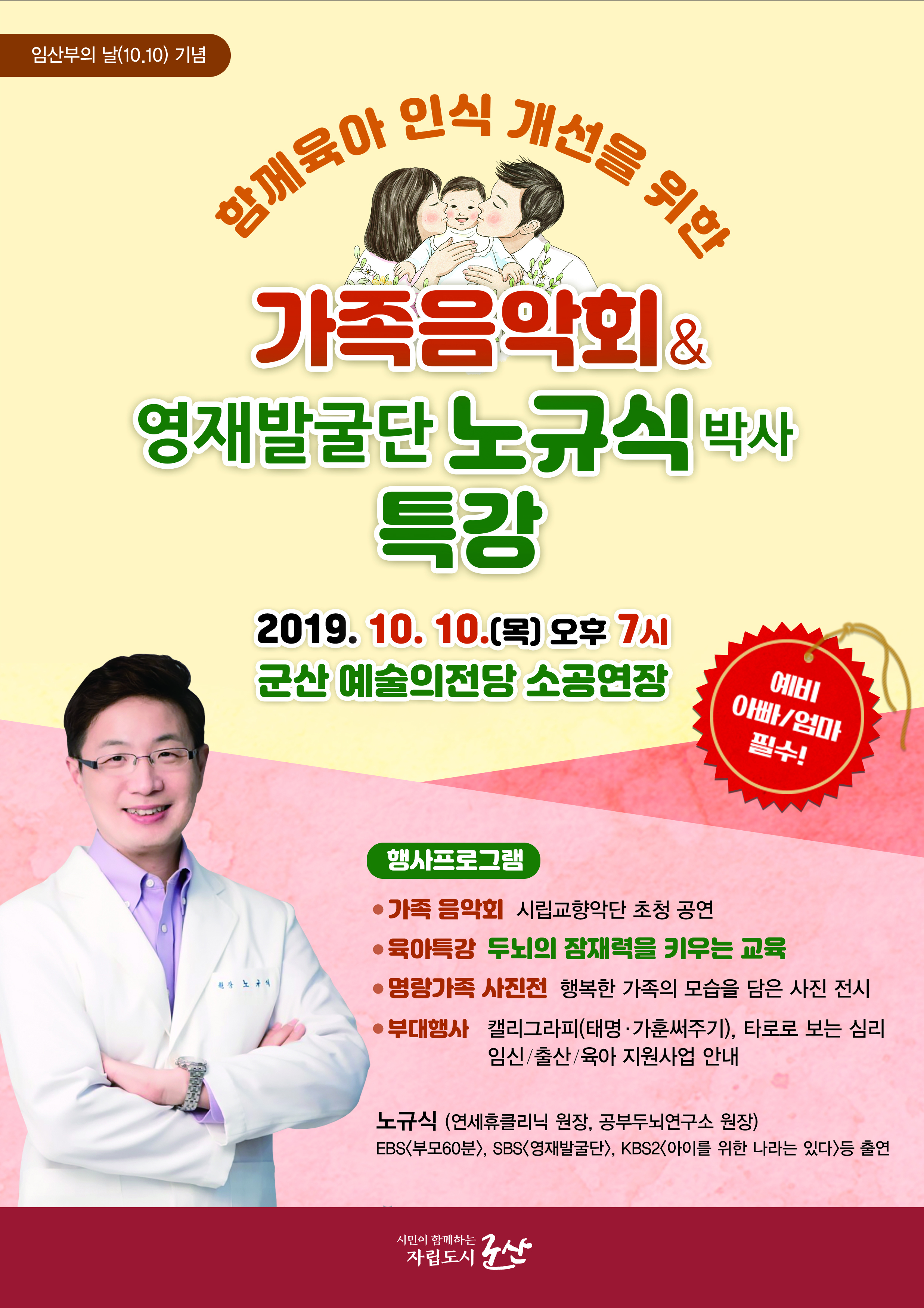 ◼ 가족 음악회 : 시립교향악단 초청 공연 ◼ 육아 인식개선 특강 ▸ 노규식 (연세휴클리닉 원장, 공부두뇌연구소 원장) - “두뇌의 잠재력을 키우는 교육” EBS<부모60분>, SBS<영재발굴단>, KBS2<아이를 위한 나라는 있다>등 출연 ◼ 사진 전시회 : 명랑가족 사진전 (50여점) ◼ 부대행사 ▸ 캘리그라피 (태명.가훈 써주기), 타로로 보는 심리 등 |