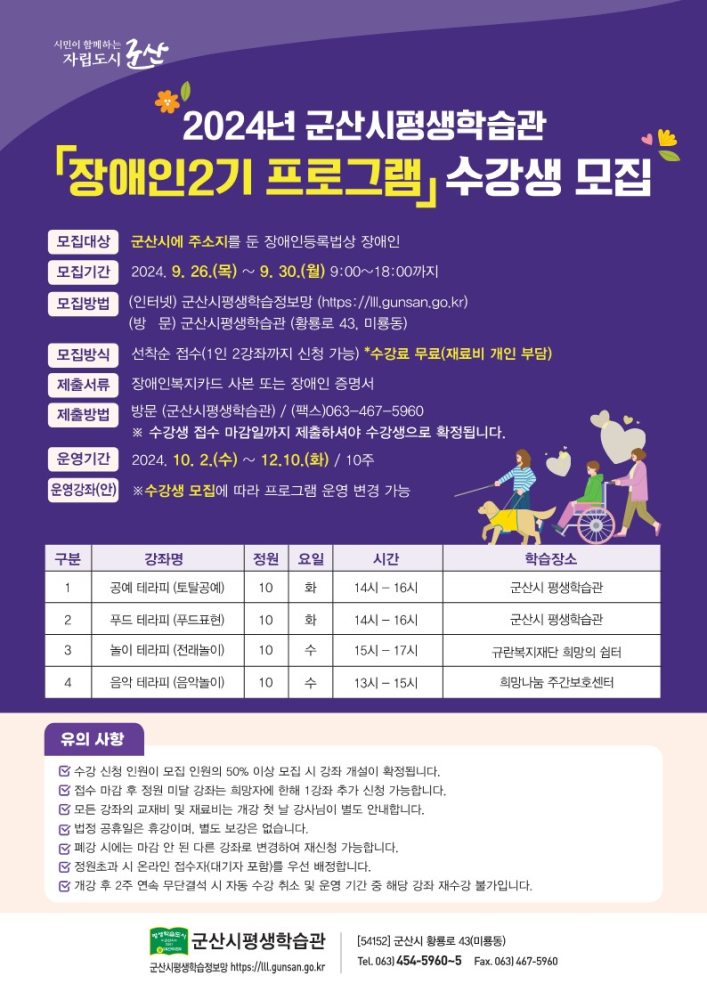 | 273 | 2024 군산시평생학습관 장애인 2기 프로그램 수강생 모집 홍보 |
