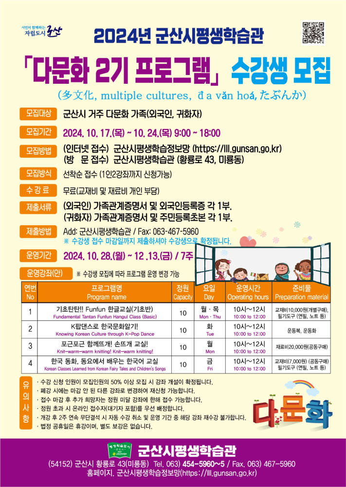 | 275 | 2024 군산시평생학습관 다문화 2기 프로그램 수강생 모집 |
