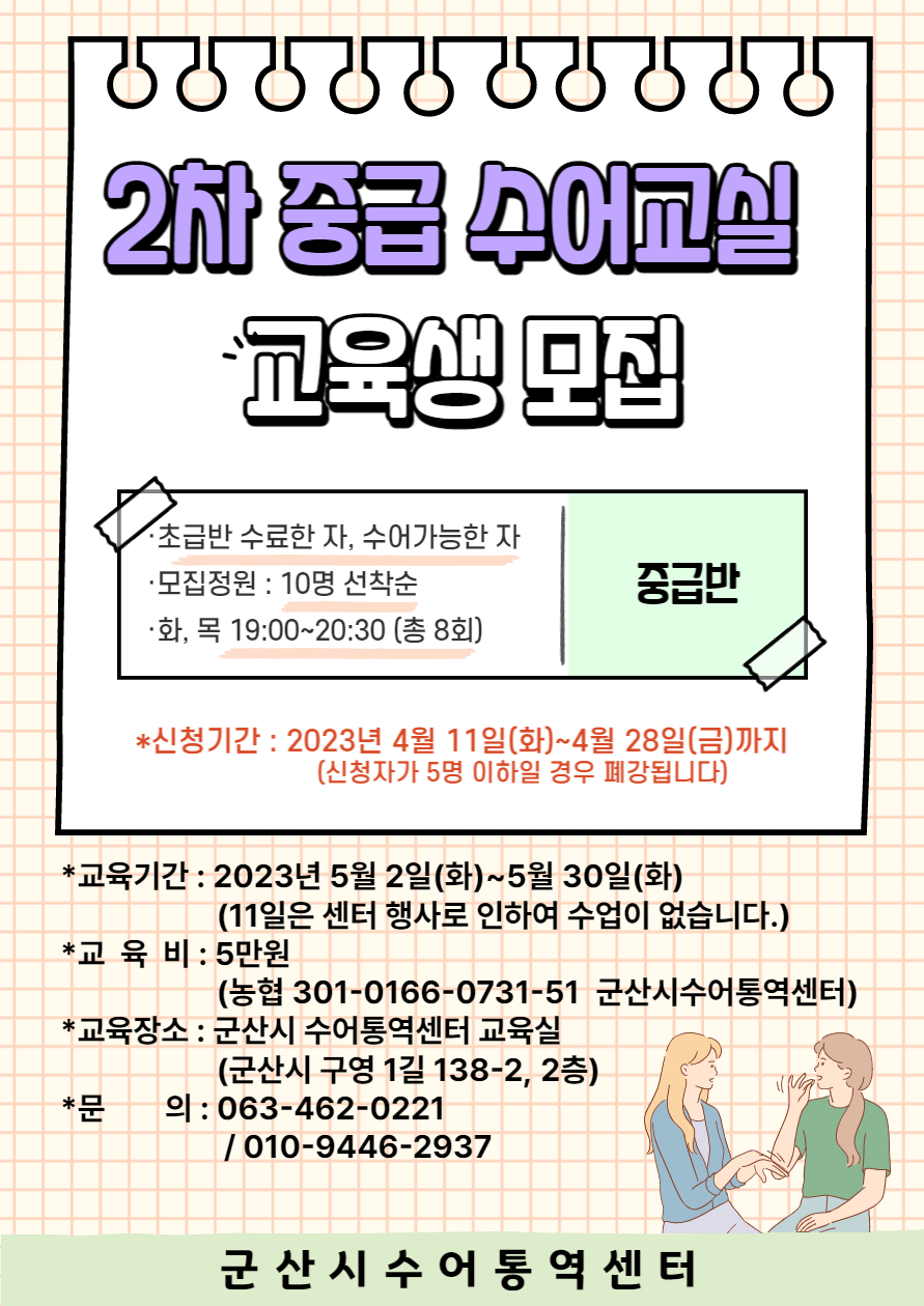 < 2023년 군산시 수어통역센터 수어교실(중급반) 안내 >