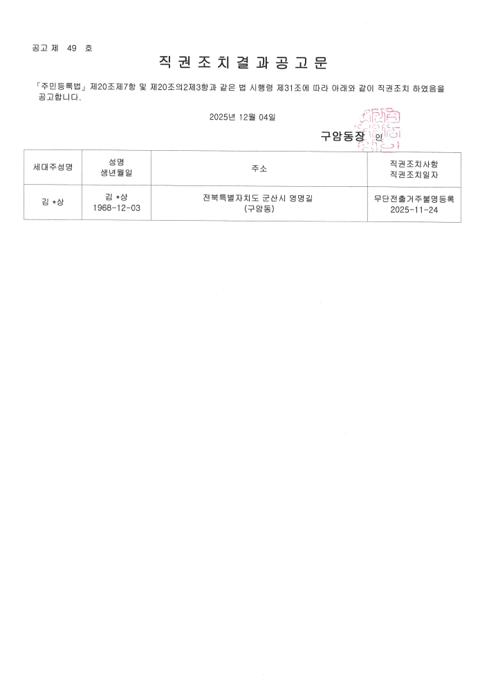 324 2025년 주민등록 사실조사에 따른 무단전출자 직권조치 결과 공고 다운받기 구암동 25.12.04 38