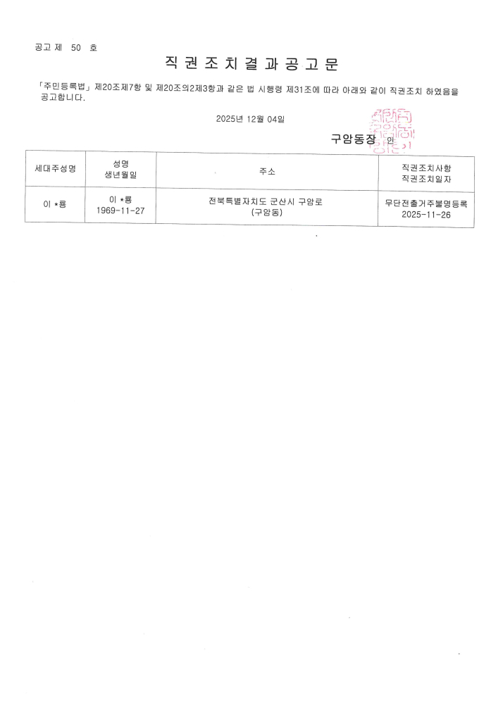 325 2025년 주민등록 사실조사에 따른 무단전출자 직권조치 결과 공고 다운받기 구암동 25.12.04 39