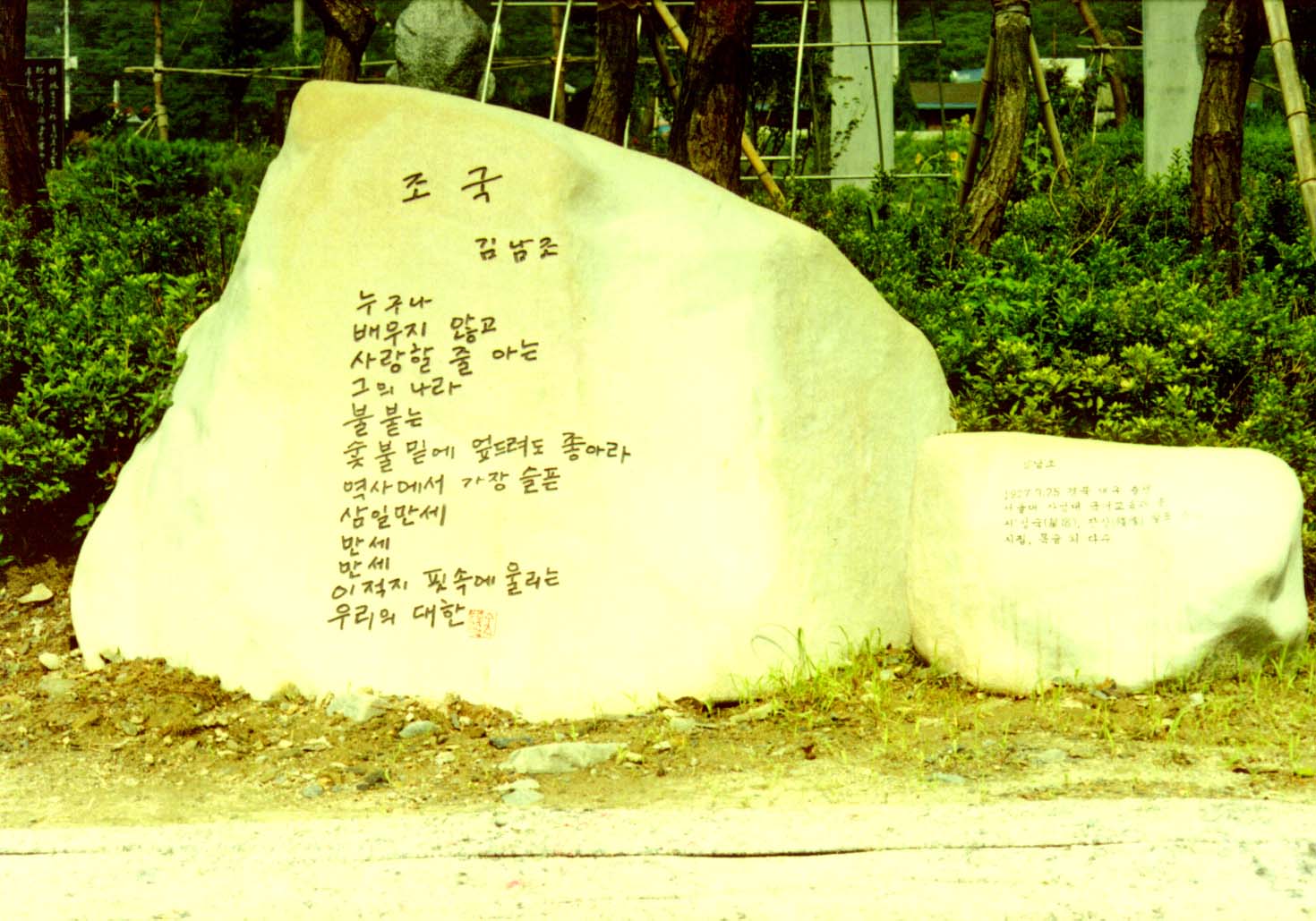 시비제작:2006년 5월 1일부터 작업 착수 시비완성:2006년 9월 22일(금) 행사일시:2006년 9월 23일(토)오후 2시 행사장소:개화예술공원내 모산한국육필문예공원(야외음악당) 설치장소:개화예술공원내 모산한국육필문예공원(충남 보령시 성주면 개화리 274번지) 참여대상:육필시비 1,2,3차 수혜자, 문인 및 가족등 지역 기관장등 약 200 여명 제작과정:충남 보령에서 나오는 오석 및 대리석 등 각종 돌을 이용하여 시비작품을 제작 주 최:한국육필문예보존회 대표고문:황금찬 시인/김남조 시인/김우종 박사/신길우 박사 대 표:이양우 시인(충남 보령 주산 샘실골 출향시인) 사무국장:박용서 시인(행사 및 행정 총괄담당) 문의전화:010-8434-3670 기술제공:거문예석