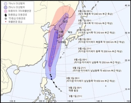 중심기압 994hPa, 최대풍속 초속 21m로 현재는 소형급 이지만, 우리나라에 본격적인 영향을 줄 것으로 예상되는 오는 6일께에는 최대풍속 초속 37m, 강풍반경 330㎞의 중형 태풍으로 커질 전망이다.