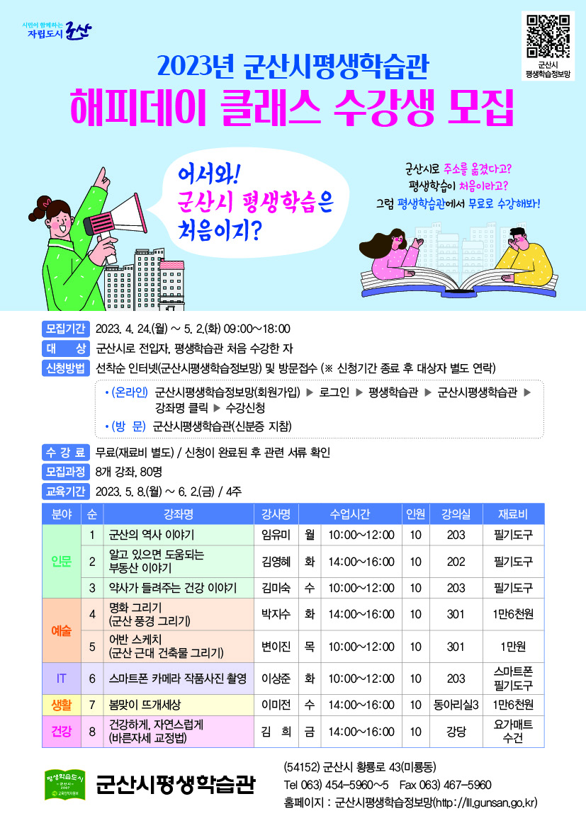 | 867 | 2023년 군산시평생학습관 해피데이 클래스 프로그램 수강생 모집 안내 |