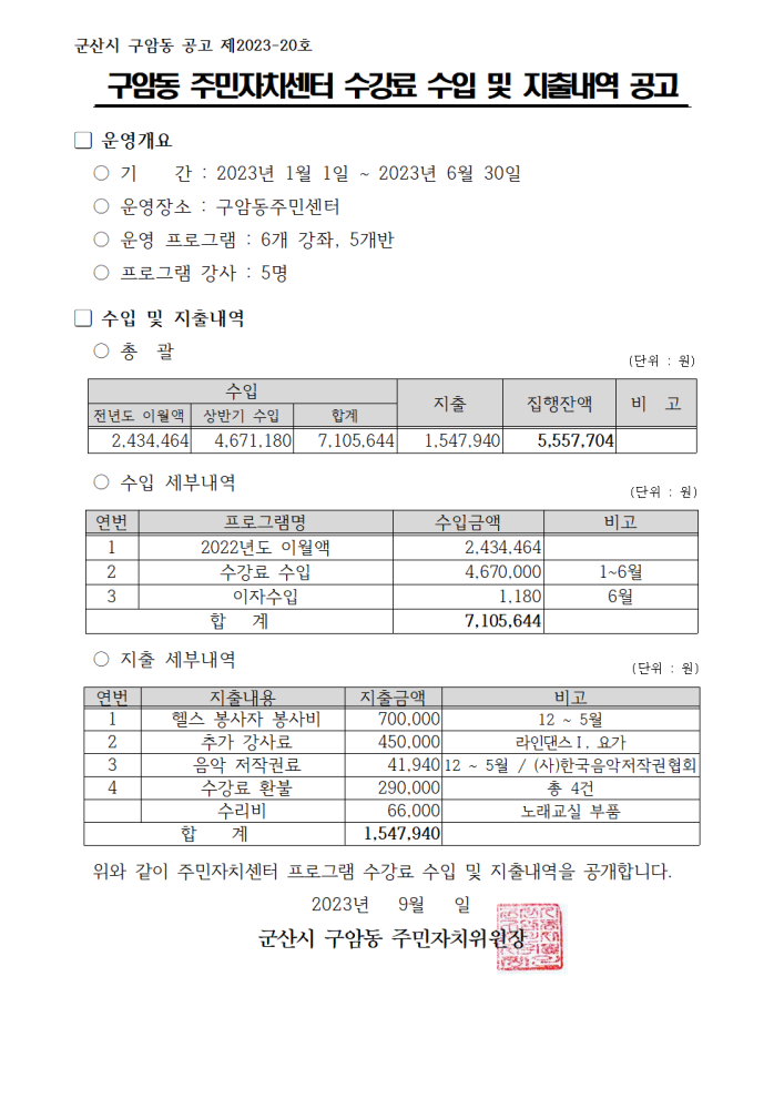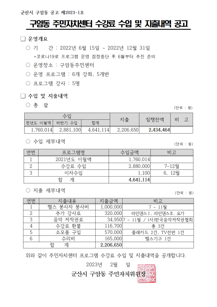 | 4 | 2023년 상반기 구암동 주민자치센터 수강료 수입 및 지출 내역 공고 |