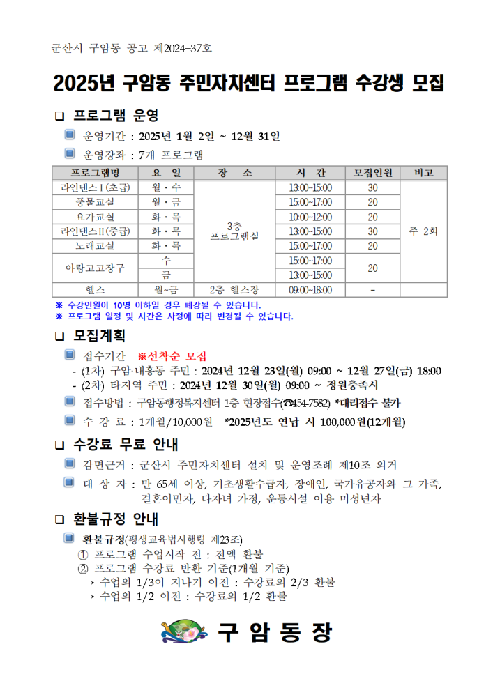 | 7 | 2025년 상반기 구암동 주민자치센터 수강료 수입 및 지출내역 공고 |