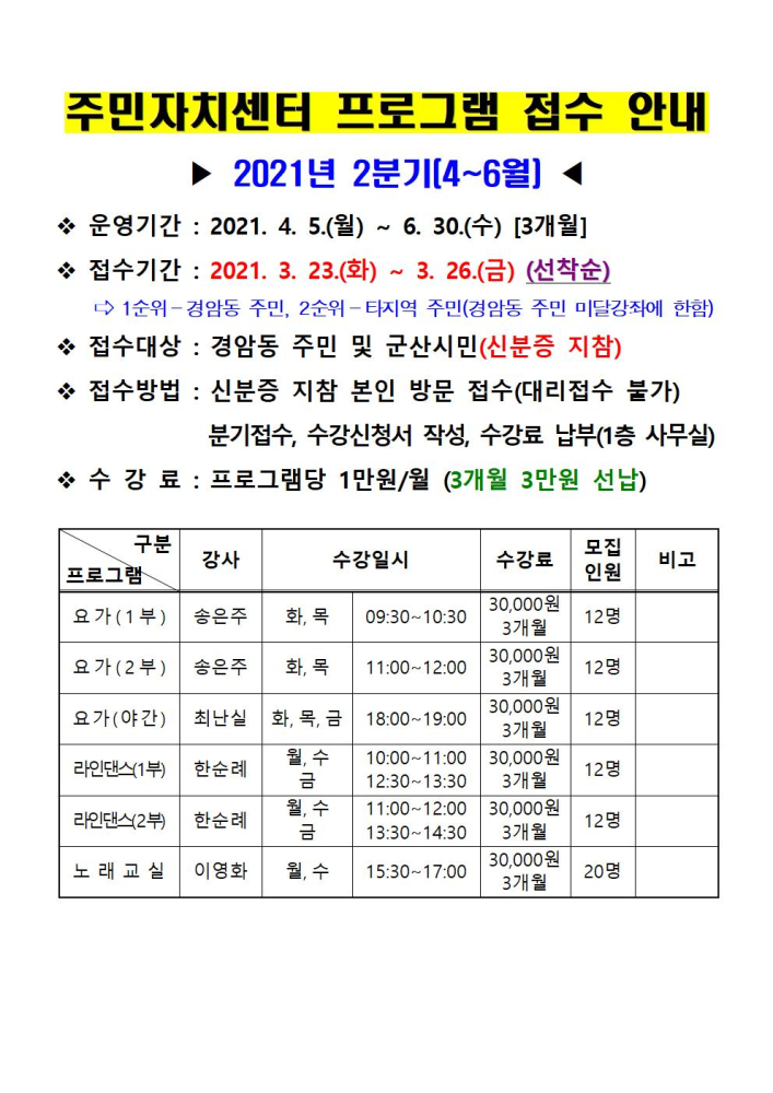 | 23 | 2021년 2분기 경암동 주민자치센터 프로그램 수강생 모집 안내 |