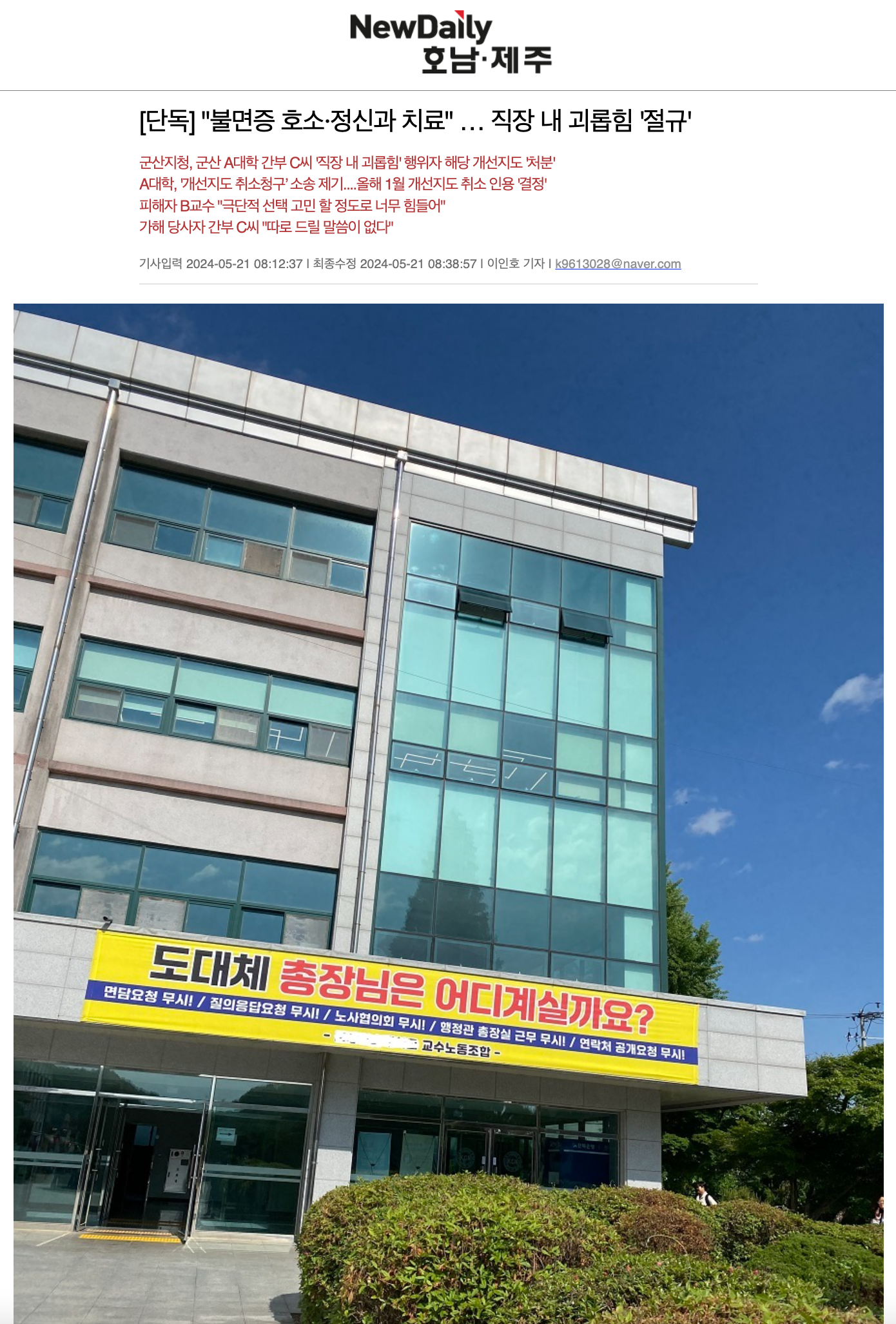 군산지청, 군산 A대학 간부 C씨 '직장 내 괴롭힘' 행위자 해당 개선지도 '처분'A대학, '개선지도 취소청구’ 소송 제기....올해 1월 개선지도 취소 인용 '결정'피해자 B교수 "극단적 선택 고민 할 정도로 너무 힘들어"가해 당사자 간부 C씨 "따로 드릴 말씀이 없다"