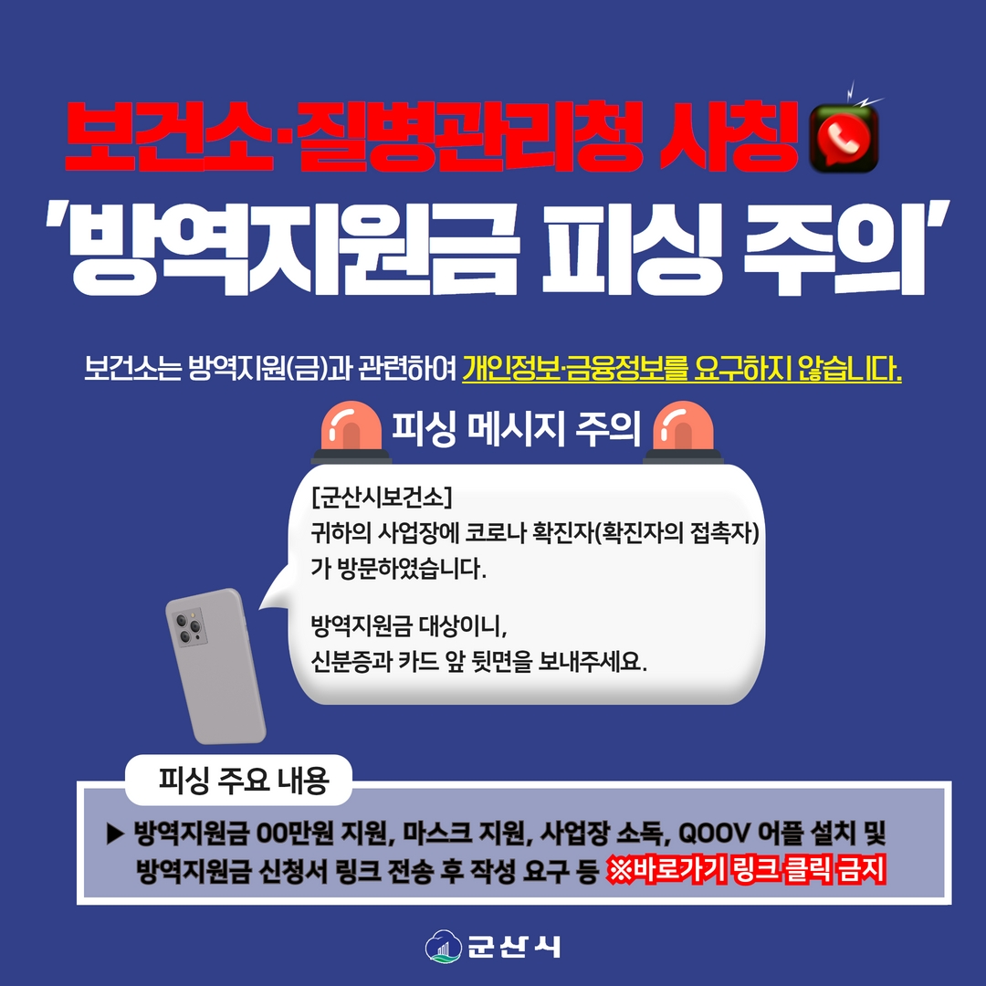 ※ 보건소, 질병관리청에서는 방역지원금과 관련하여 개인정보, 금융정보를 요구하지 않습니다 ※