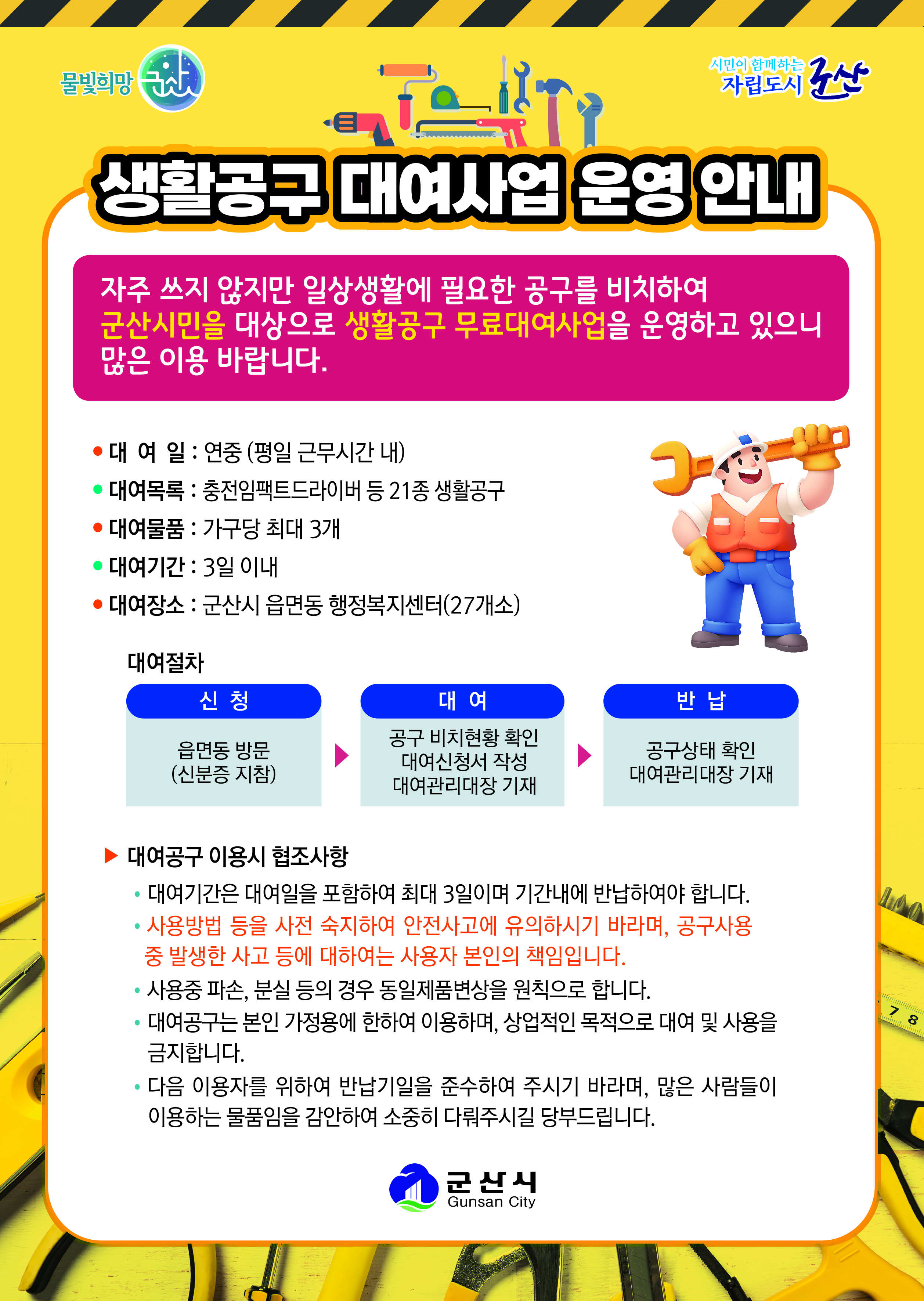 생활공구 무료대여사업을 운영하고 있으니 많은 이용 바랍니다.