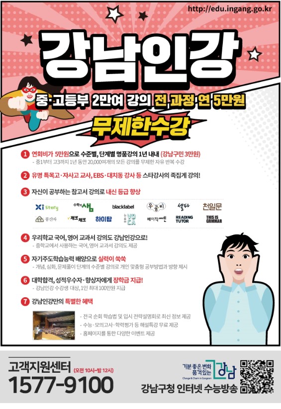 남구에서 전국 중·고등학생을 대상으로, 저소득층 가정 학생들에게 균등한 교육기회를 제공하고자 「강남인강 정회원 무료지원」 사업을 추진하고 있습니다.
