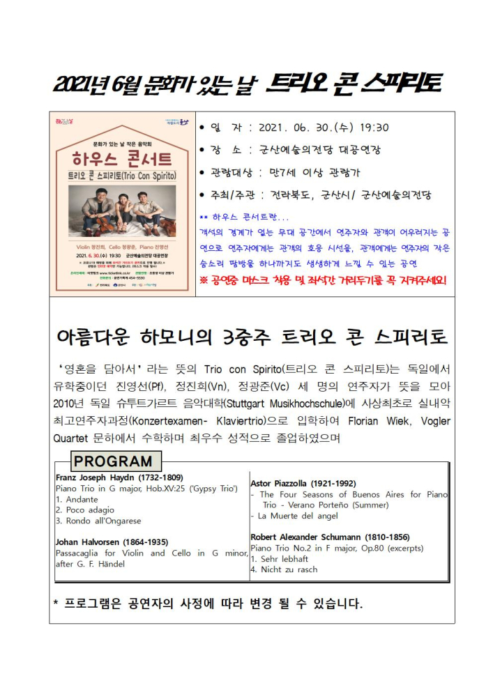 | 234 | 예술의전당 기획공연 "하우스콘서트 트리오 콘 스피리토" 안내 |