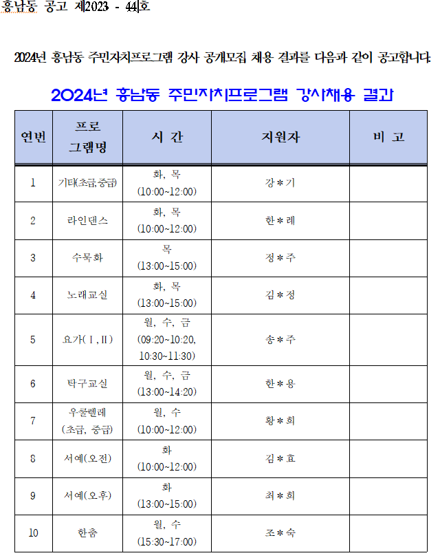 | 334 | 24년 흥남동 주민자치센터 프로그램 강사 공개모집 선정 결과 공고 |