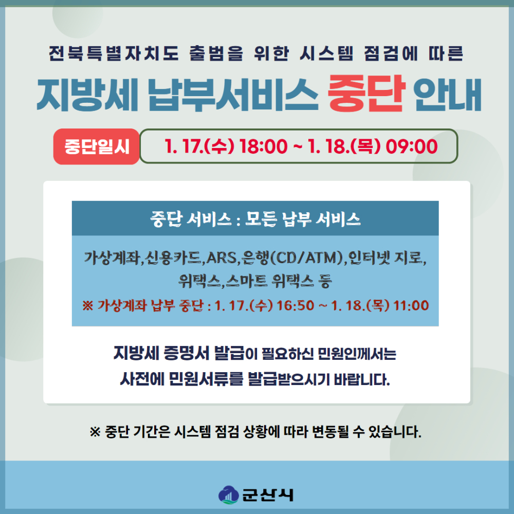 | 339 | 전북특별자치도 출범을 위한 시스템 점검에 따른 지방세 납부서비스 중단 안내 |