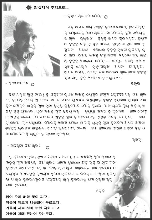 우리 시설의 많은 어르신 중 유독 일부러 머리를 스님같이 하얗게 치장(?)하시는 우리 할머니, 우리 할머니 방 창 너머로 보이는 교회의 십자가가 해질녘 불빛을 발산하며 창 안에 스며들어 어르신의 마음을 감싸 안아 충만한 은총이라도 내리는 듯하다. 저녁 식사가 끝날 즈음 밤새 드실 물을 챙기시며, 방에 자리를 잡고 누우실 때는 "선생님! 기저귀 좀 갈아줘요." 하며 아이같이 채근을 하신다. 그리고서 이내 창문을 향해 돌아앉으시고는 간절한 기도를 드리신다. " 하나님 아버지! 감~사합니다." "우리아들 배타고 나가서 배 가득 생선을 잡아 돌아오게 하시고 하루에 4만원만 벌어오게 하옵소서." " 하나님 감사합니다." "아~멘" 우리 할머니의 간절한 소원이 생전 내내 이루어지기를 말없이 눈 적시며 빌어본다.
