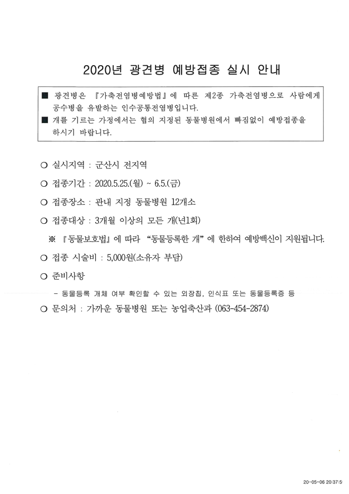 | 21 | 2020년 광견병 예방접종 실시 안내 |