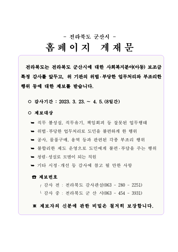 | 5801 | 전라북도 사회복지분야(아동) 보조금 특정감사 안내 |