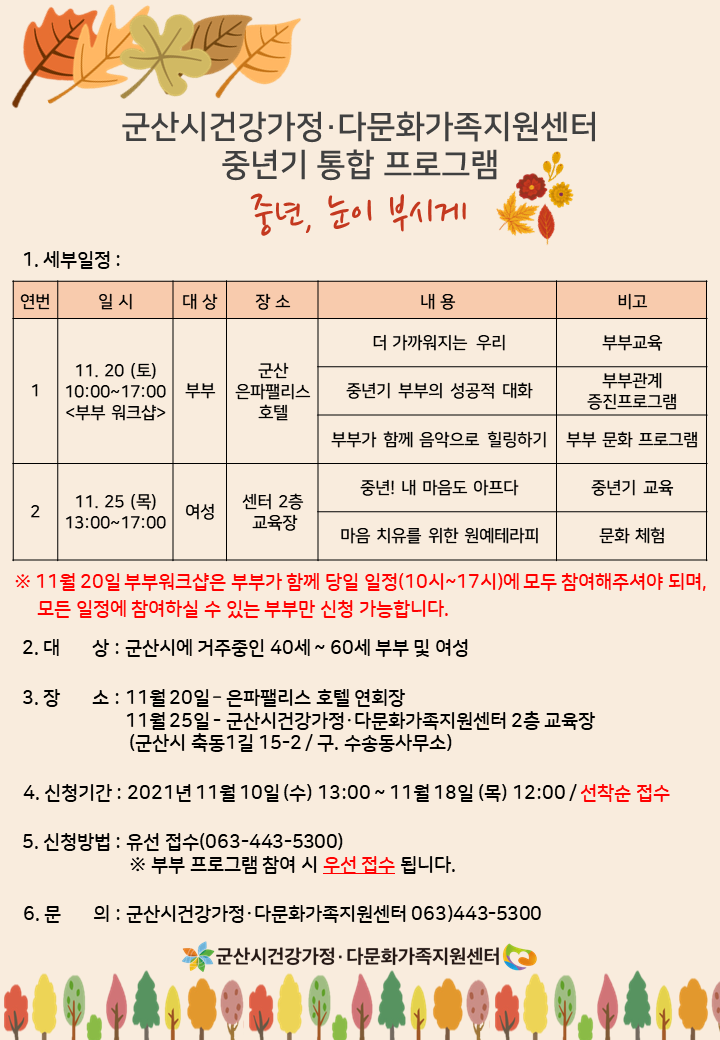 (군산시 건강가정다문화가족지원센터) 중년기 통합 프로그램 홍보 및 참여신청 안내
