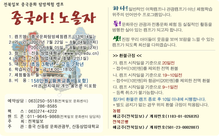 2007 여름방학을 맞아 청소년을 위한 "중국아!노올자"캠프를 주최합니다.