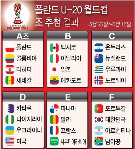 2019 국제축구연맹(FIFA) 폴란드 U-20 월드컵(5월 23일~6월 16일)에 나서는 한국 축구가 '강호' 포르투갈, 아르헨티나, 남아프
