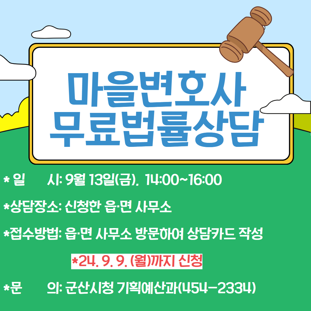 법률 사각지대에 있는 무변촌 지역 주민들의 법률복지 향상을 위하여 2024년도 3분기 마을변호사 무료법률상담을 시행하니, 많은 신청 부탁드립니다.