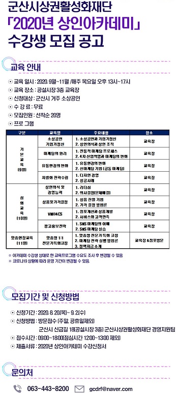 상인들의 의식개선과 새로운 변화에 대응하고 자생력을 강화하고자 군산시상권활성화재단 「2020년 상인 아카데미」 수강생을 모집하고자 하오니 많은 참여 바랍니다.