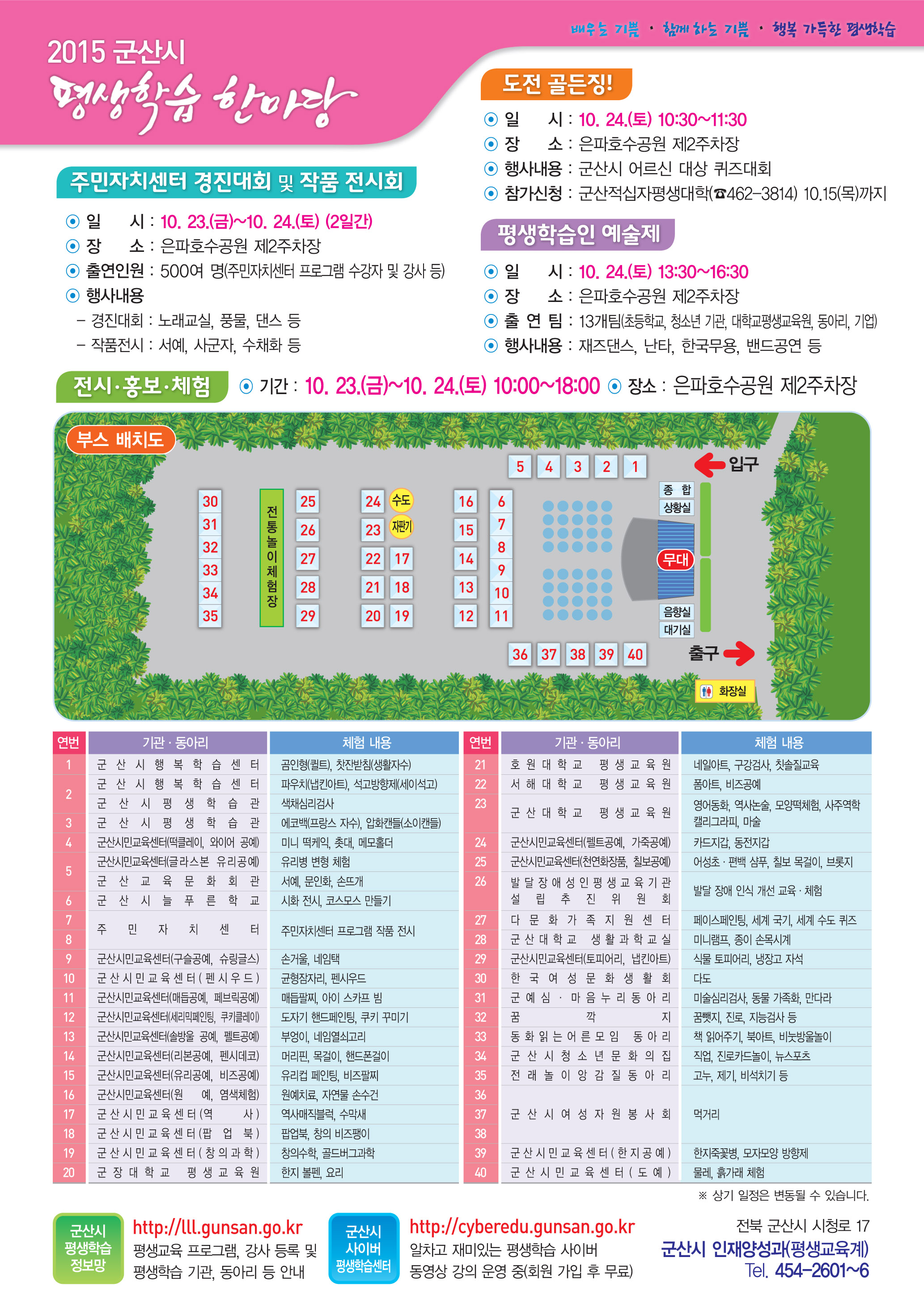 군산시에서는 배우는 기쁨, 함께하는 기쁨, 행복 가득한 평생학습 도시조성을 위하여 『2015 군산시 평생학습 한마당』 행사를 실시합니다.