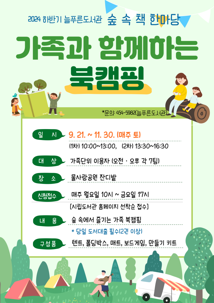 | 356 | 2024 하반기 늘푸른도서관 숲 속 책 한마당 '가족 북캠핑' 운영 안내 |