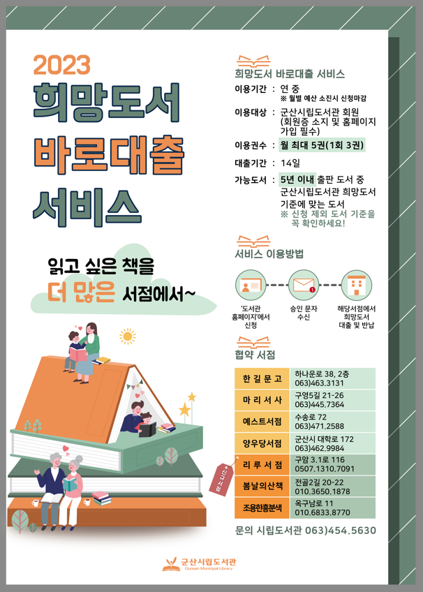 | 233 | 2023 군산시립도서관 희망도서바로대출 협약서점 확대운영 |