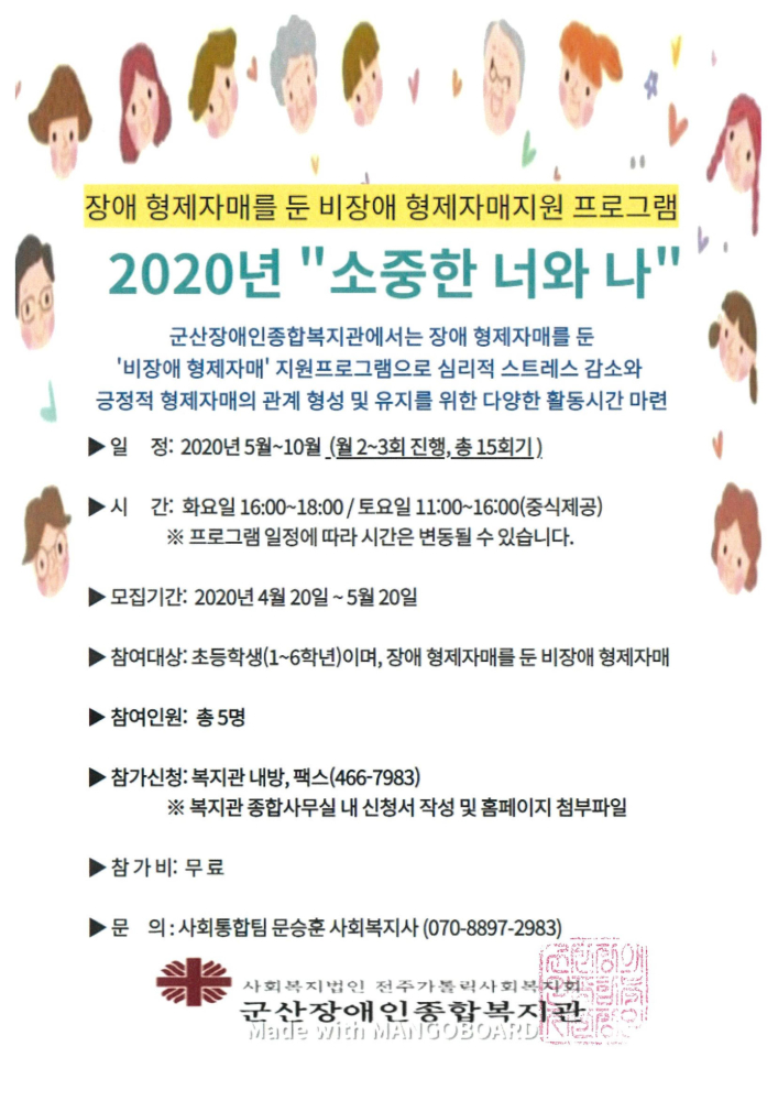 | 101 | 2020년 군산장애인종합복지관 ‘소중한 너와 나’ 비장애 형제자매지원 프로그램 모집 안내 |